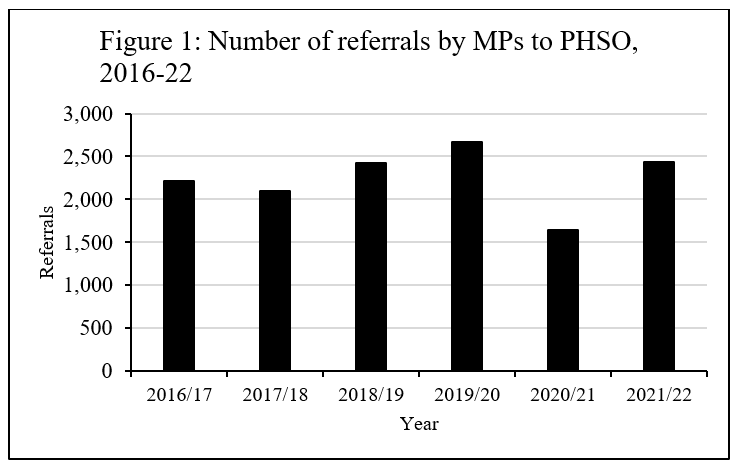 We can start with figure 1. This displays the total number of complaints referred by MPs to the PHSO over the years 2016-22.