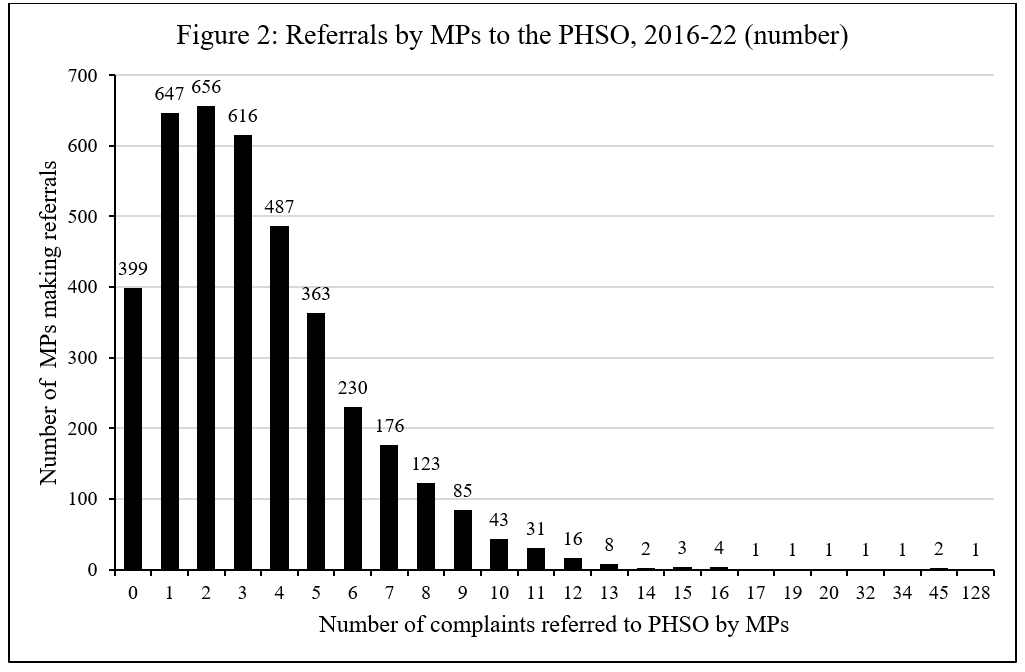 Some 399 MPs referred no complaints to the PHSO whereas 647 MPs each referred one complaint and 656 MPs referred two complaints (a total of 1,312 complaints). Some 616 MPs each referred three complaints – a total of 1,848 complaints – and 487 MPs referred four complaints (a total of 1,948 complaints) and so on. As is apparent, the number of complaints referred declines. At the right end of the figure, there was one MP who referred 128 complaints (and these were all referred in the same parliamentary session.