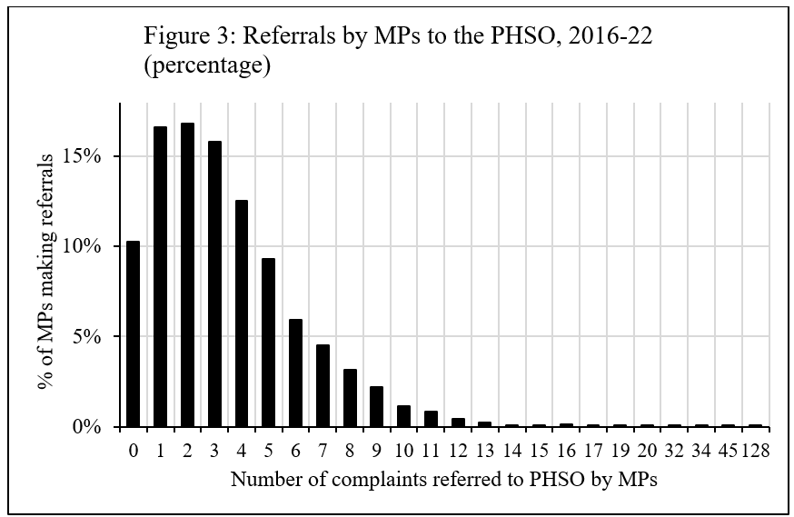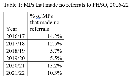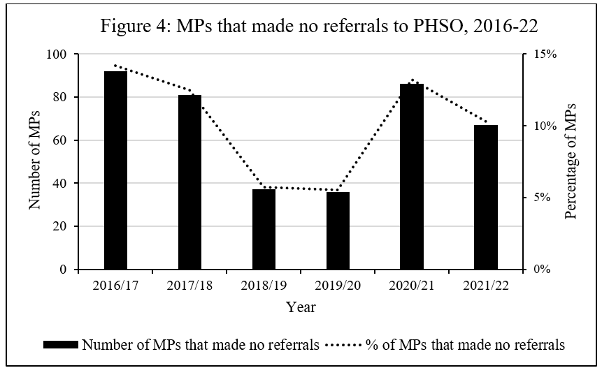 What is notable here is that in four years of the six years for which we have data, the percentage of MPs who referred no complaints to the PHSO exceeded 10 per cent of all MPs in the House of Commons. It is a consistent trend in the data that a significant proportion of MPs do not refer complaints to the PHSO. These are not the same 10 per cent of MPs from one year to the next. Nonetheless, this is a sizeable proportion of MPs elected to the House of Commons.
