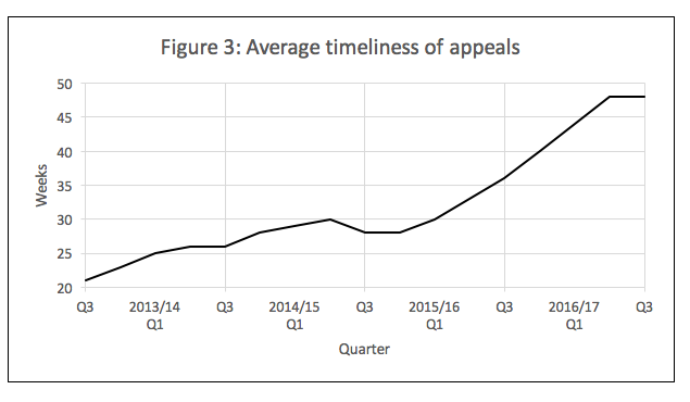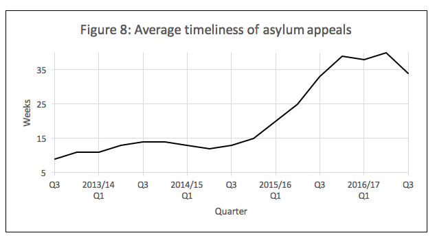 Another development has been the increased amount of time taken to decide asylum appeals. In the past, there has been an intense focus on the timeliness of asylum appeals. Yet, the average number of weeks taken by such appeals has almost quadrupled from nine weeks in Q3, 2012-13 to 34 weeks in Q3, 2016-17 (Figure 8). The number of asylum appeals decided has varied over time with reductions and increases. Nevertheless, there is a legitimate interest in the timely determination of such appeals in terms of both the public interest and the need to afford international protection to refugees.