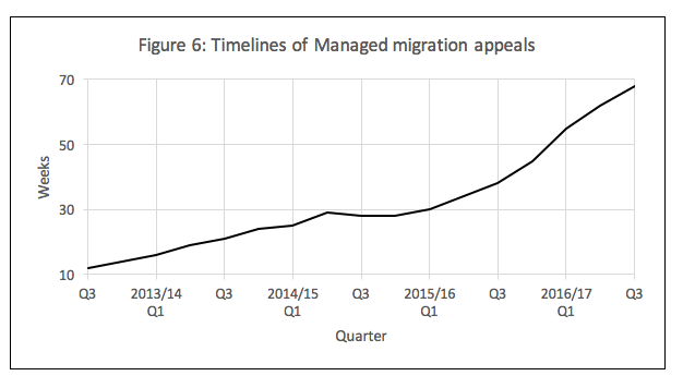 There is a similar trend in relation to managed migration appeals. The number of appeals being decided has declined, yet the time taken has increased. The average timeliness of such appeals has more than doubled over the last couple of years (see Figures 6 & 7). Again, the success rate of managed migration appeals has regularly exceeded 40 per cent.
