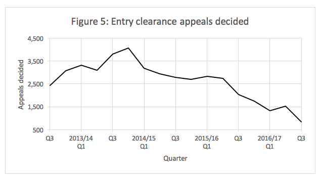 It might be expected that an increase in the amount of time taken to decide cases would be the inevitable consequence of an increase in the number of appeals being heard and decided. However, the number of appeals being decided has actually fallen as Figure 5 shows. In quarter three of 2014/15, the tribunal decided 2,791 entry clearance appeals. Two years later, it decided only 840 such appeals. In other words, during a period in which the number of appeals being decided has dropped, the amount of time taken to decide appeals has increased substantially.
