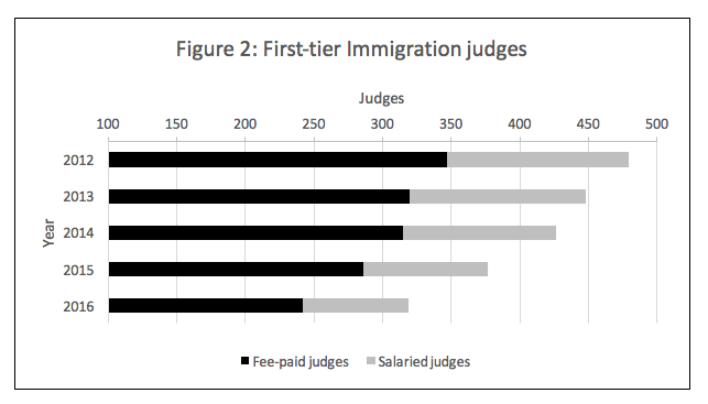 What then has happened to the number of Immigration Judges? As Figure 2 shows, the number of judges has been reduced by a third from 479 judges in 2012 to 319 judges in 2016. The proportion of both fee-paid and salaried judges has reduced by 30 per cent and 42 per cent respectively. It is to be expected that the number of judges would decline in line with the reduced number of appeals. Nevertheless, the number of outstanding appeals does raise the question as to whether the reduction in judges has been too large and taken place too quickly given the outstanding caseload.