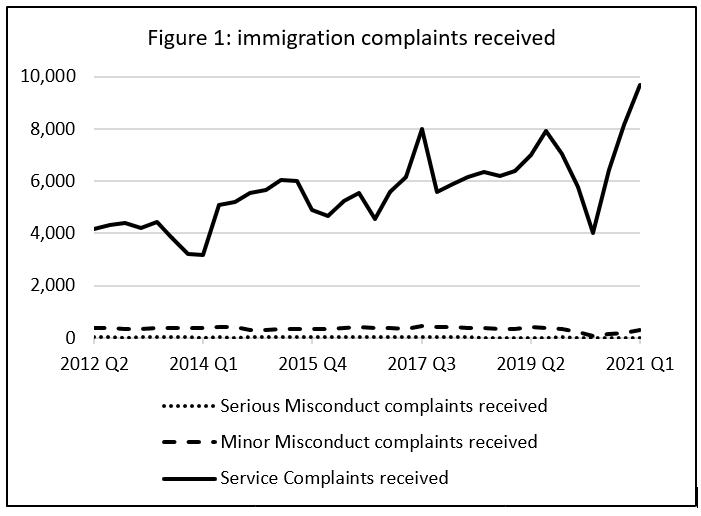 Now we can look at volumes. Figure 1 shows the number of complaints received as regards UK Visas & Immigration customer service operations. This directorate handles immigration casework. As figure 1 shows, the vast majority of immigration complaints are service complaints, with much lower levels of minor and serious conduct complaints. There is an obvious downswing and upswing in line with the pandemic.